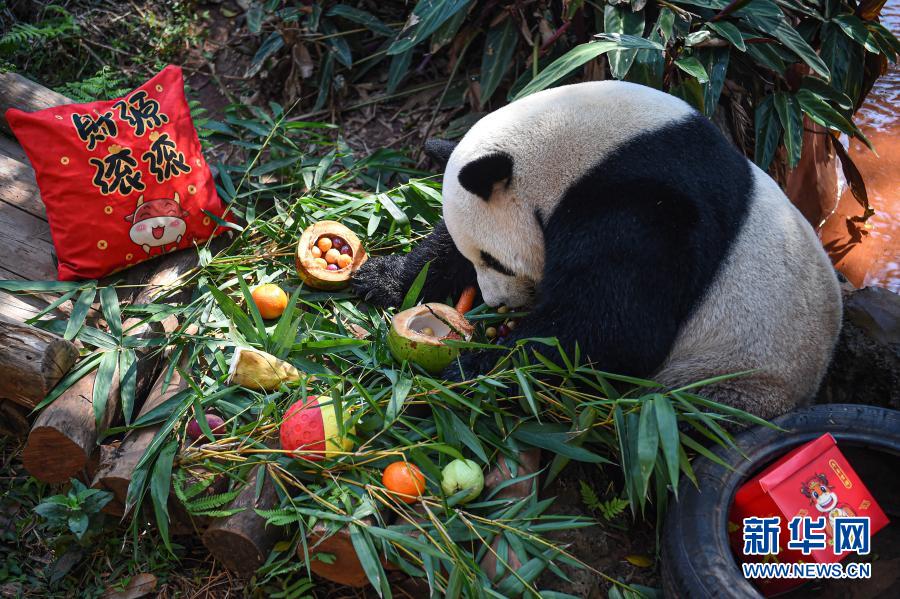 2月25日,在位于海口的海南热带野生动植物园,大熊猫“舜舜”在享用“汤圆”等美食。
