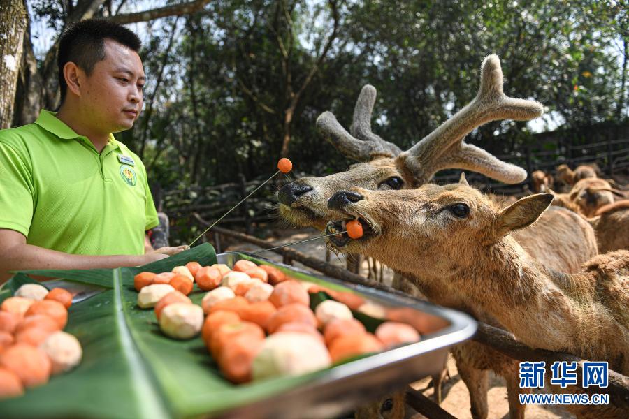 2月25日,在位于海口的海南热带野生动植物园,工作人员为麋鹿喂“汤圆”。
